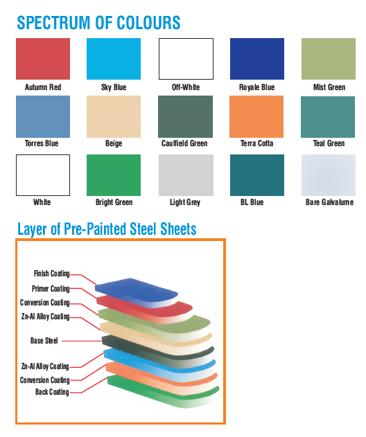 The following are the commonly used colors available in both PPGI and PPGL metal roofing sheets.